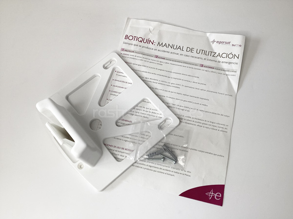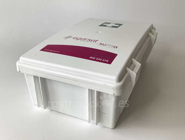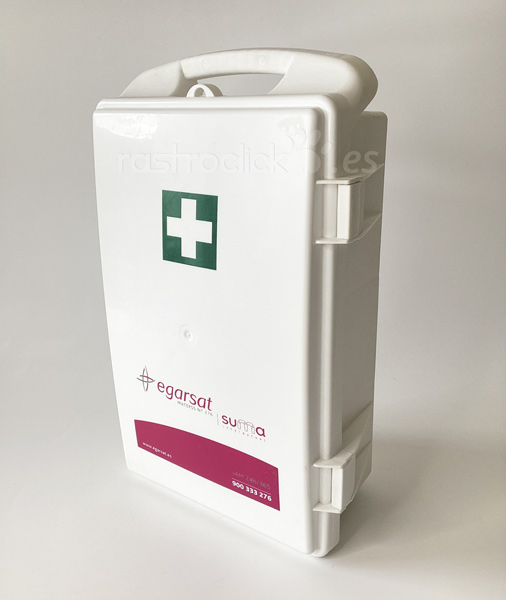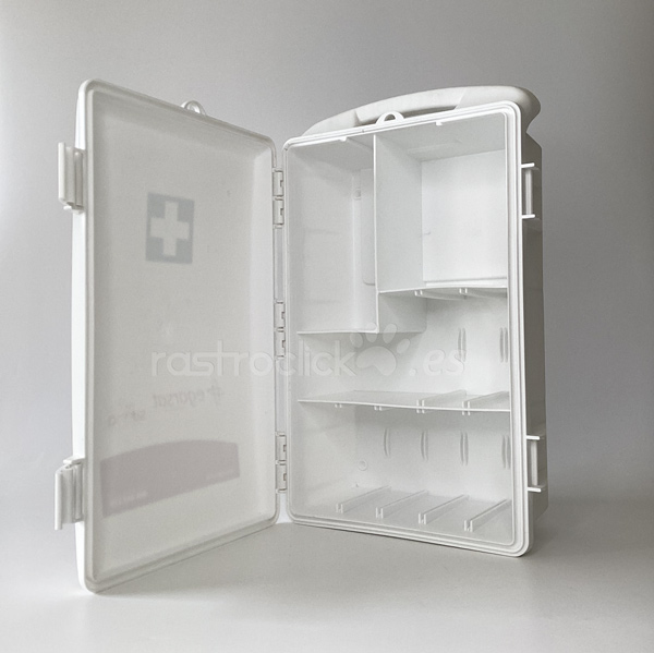 Botiquín vacío para colgar en la pared. Tiene un asa para descolgarlo y poder transportarlo de forma rápida y sencilla. Hecho para Egarsat Mutua Colaboradora con la Seguridad Social. Está vacío. Es un artículo usado, estuvo colgado de la pared de un edificio público. Incluye soporte para poder colgarlo de la pared y manual de uso. Mide 42 x 27,5 x 14,5 cm.