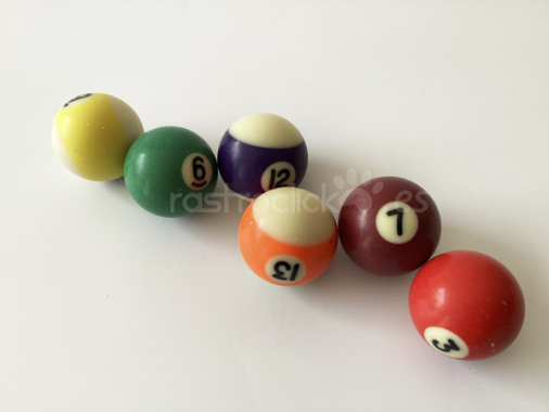 Bolas de billar de 3,5 cm de diámetro. Se venden por unidad. El precio es de cada unidad, cosultad para varias unidades. Las disponibles son: Ralladas, números: 9, 12 y 13. Lisas: 3, 7 y 9.
