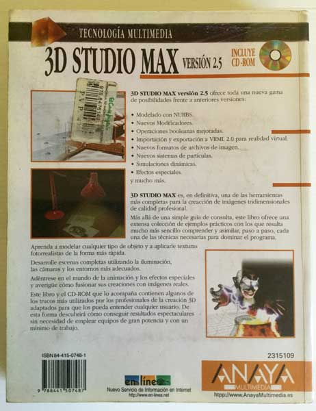 3D Studio Max. Versión 2.5. Ediciones Anaya Multimedia S.A. 1998. Ilustración de cubierta: Javier Bootello Burgos e Ignacio Thomas Tejedor. No incluye CD porque se extravió. En muy buen estado. Con forro transparente en las tapas.