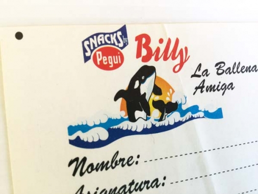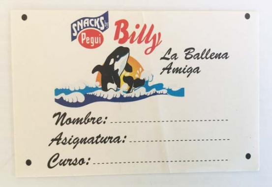 Adhesivo escolar de los Snacks Pegui, La Ballena Amiga. Era para ponerlo en la libreta del colegio. Años 90. En buen estado, tan solo tiene una pequeña arruga en medio, apenas se aprecia.