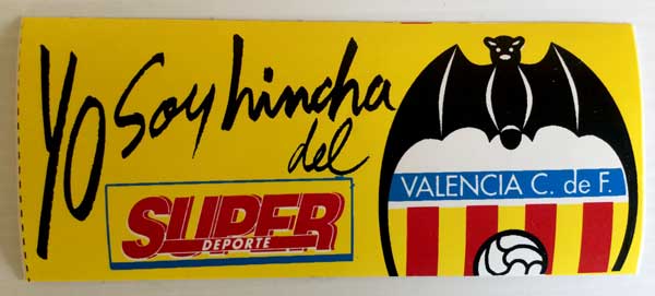 Adhesivo del Valencia Club de Fútbol. Con la frase: “Yo soy hincha del…”. Regalo del periódico Super Deporte por los años 90. Mide 12,5 cm x 5,2 cm. En buen estado, no pegado nunca.