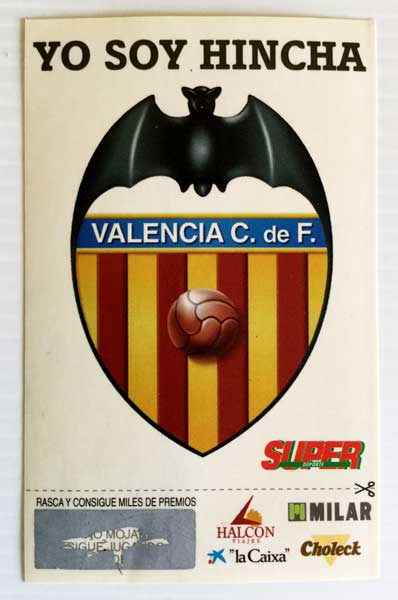 Promoción del periódico Super Deporte en los años 90, adhesivo con el escudo del Valencia CF con la frase: “Yo soy hincha”. El adhesivo mide: 9,5 cm x 5,8 cm. Era un rasca en el que podías ganar premios. En buen estado, no pegado nunca. El estado del recuadro rascado puede variar al que aparece en la foto, ya que tengo varias unidades y en cada uno está rascado de una forma distinta.