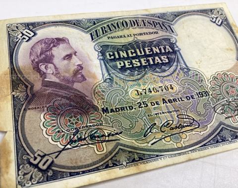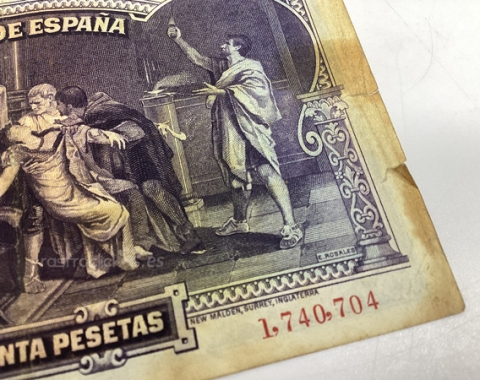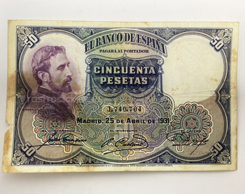 Billete de 50 pesetas 1931. Sin Serie, 1,740,704. Anverso, Eduardo Rosales. Reverso, La muerte de Lucrecia. Tamaño papel: 13x8,5cm. Se encuentra tal cual se aprecia en las fotos.