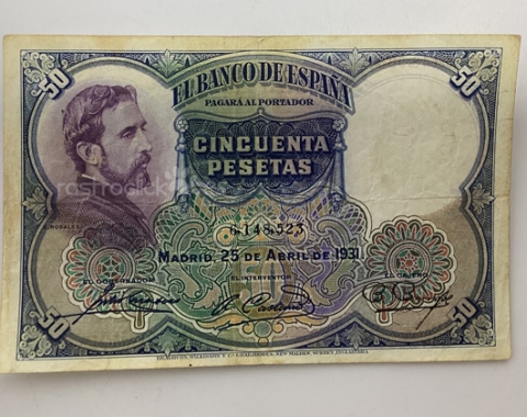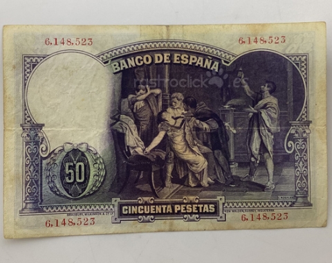 Billete de 50 pesetas 1931. Sin Serie, 6,148,523. Anverso, Eduardo Rosales. Reverso, La muerte de Lucrecia. Tamaño papel: 13x8,5cm. Se encuentra tal cual se aprecia en las fotos.