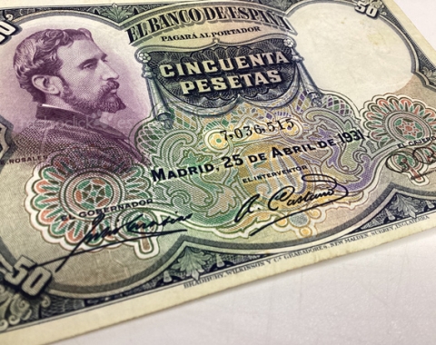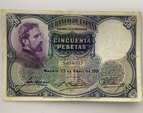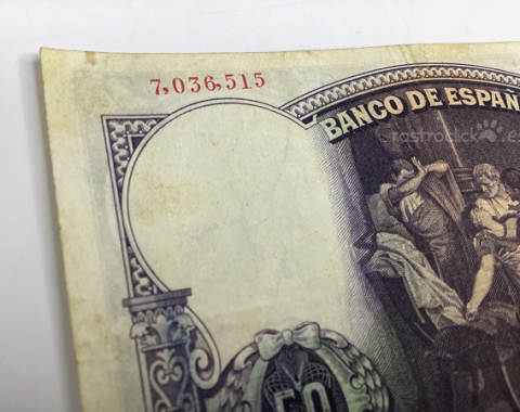 Billete de 50 pesetas 1931. Sin Serie, 7,036,515. Anverso, Eduardo Rosales. Reverso, La muerte de Lucrecia. Tamaño papel: 13x8,5cm. Se encuentra tal cual se aprecia en las fotos.