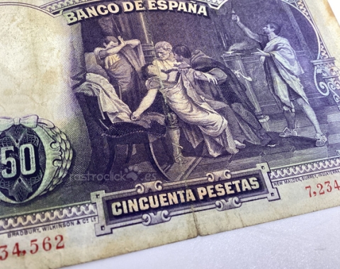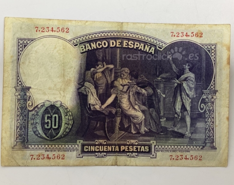 Billete de 50 pesetas 1931. Sin Serie, 7,234,562. Anverso, Eduardo Rosales. Reverso, La muerte de Lucrecia. Tamaño papel: 13x8,5cm. Se encuentra tal cual se aprecia en las fotos.