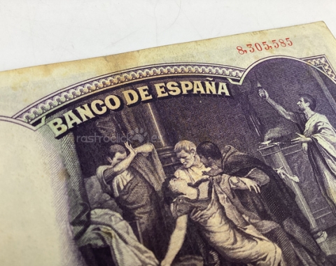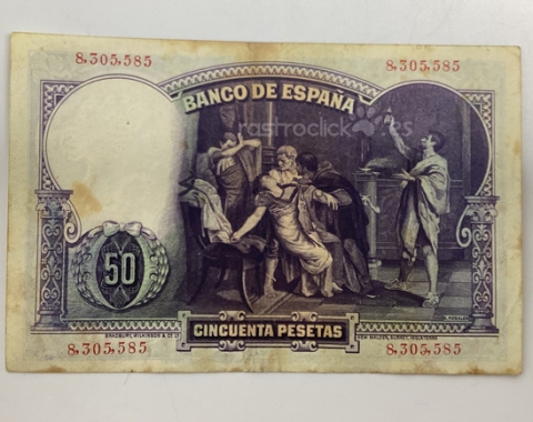 Billete de 50 pesetas 1931. Sin Serie, 8,305,585. Anverso, Eduardo Rosales. Reverso, La muerte de Lucrecia. Tamaño papel: 13x8,5cm. Se encuentra tal cual se aprecia en las fotos.