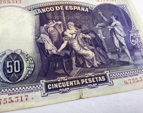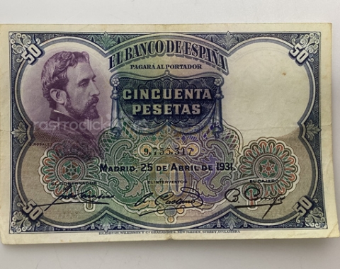 Billete de 50 pesetas 1931. Sin Serie, 9,755,317. Anverso, Eduardo Rosales. Reverso, La muerte de Lucrecia. Tamaño papel: 13x8,5cm. Se encuentra tal cual se aprecia en las fotos.