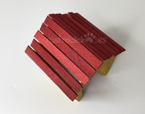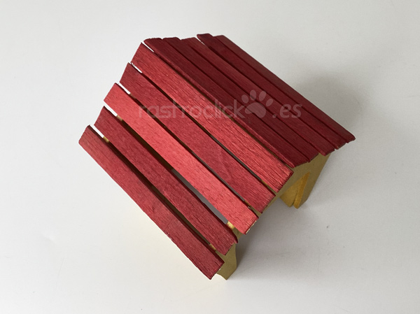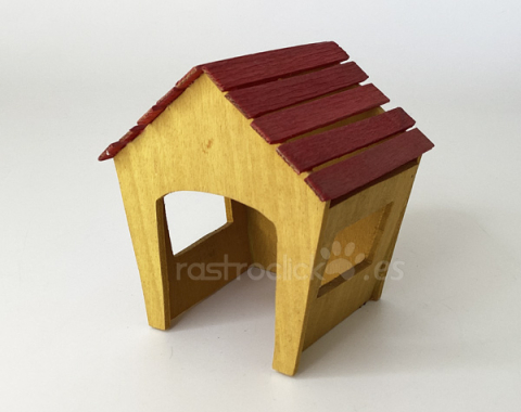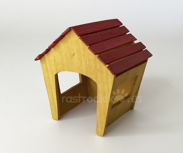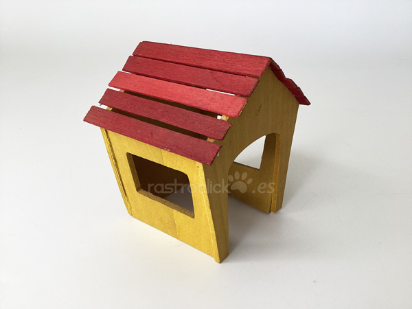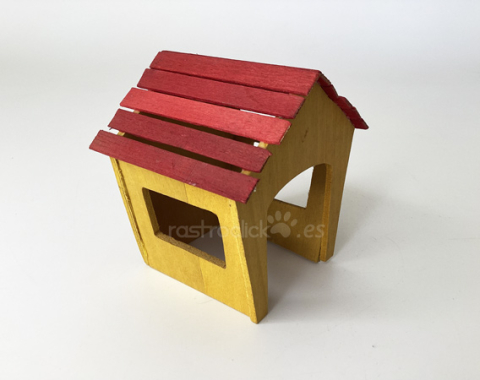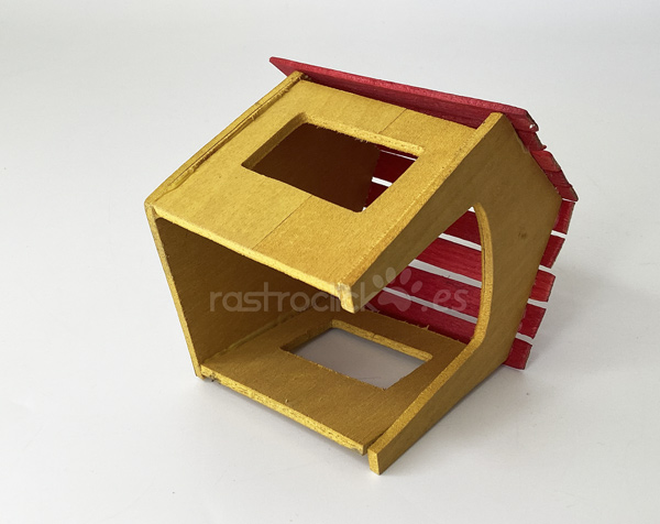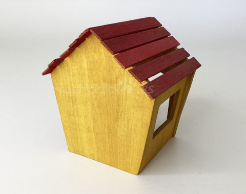 Casita de madera. Seguramente fue un trabajo escolar de marquetería. Es de mediados de los años 60. Con madera fina cortada a mano. El tejado está hecho con palitos de madera cortados a mano. Pintada a mano. Todo pegado con pegamento fuerte.