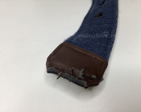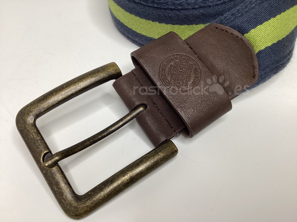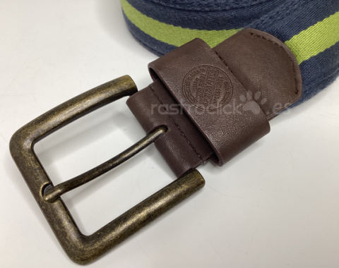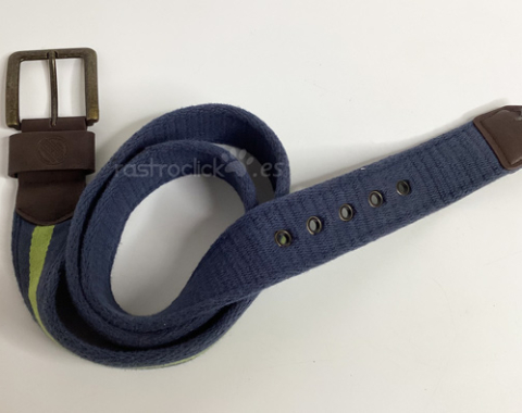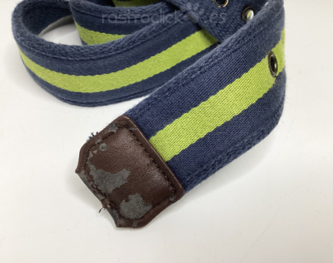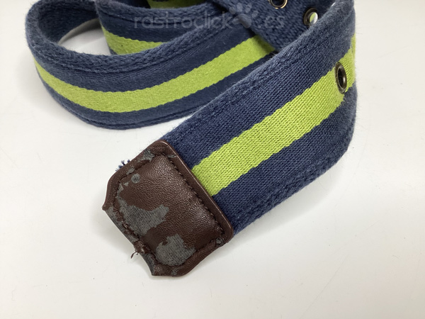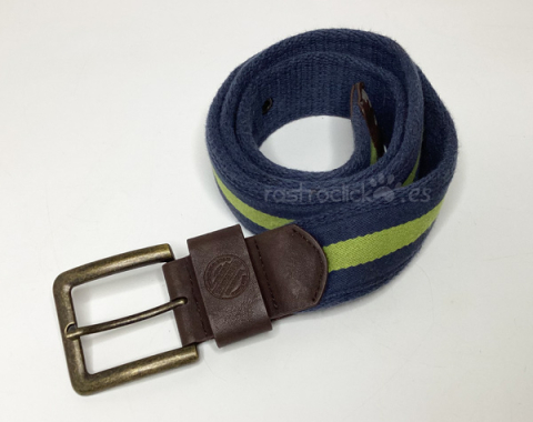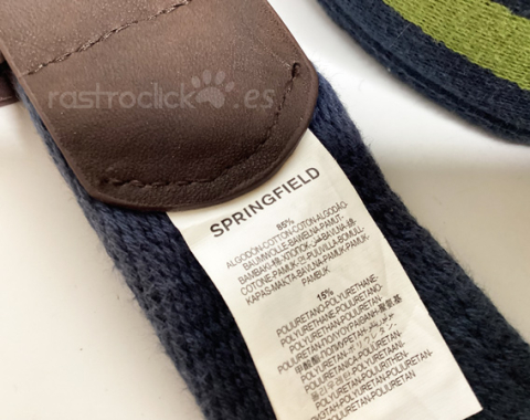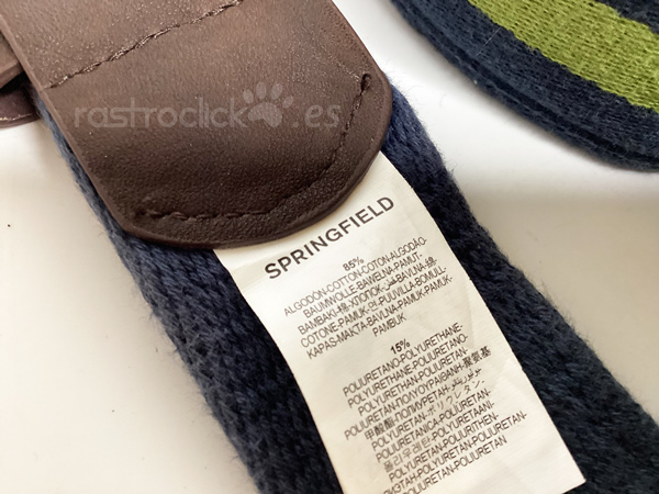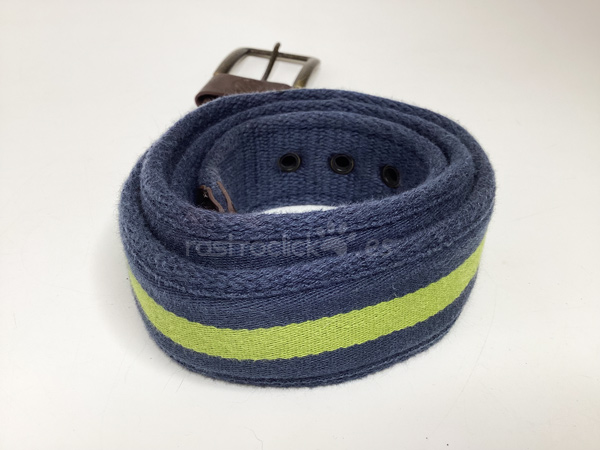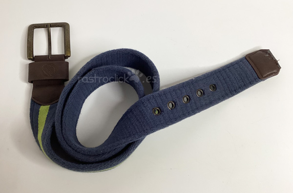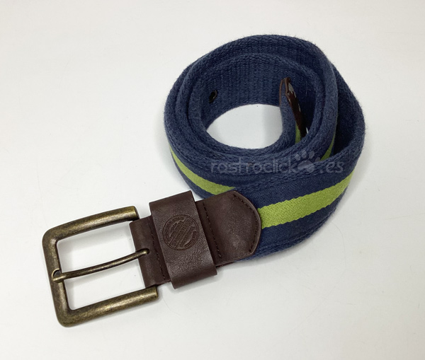 Cinturón de tela Springfield. Composición: 85% algodón y 15% poliuretano. Está bastante bien, pero en el otro extremo que se engancha a la hebilla tiene algo pelado el polipiel. El cinturón tiene de longitud, sin contar con la hebilla 117,5cm. De ancho tiene 4cm. La longitud desde el agujero más cercano del final del cinturón hasta la hebilla es de 109cm.