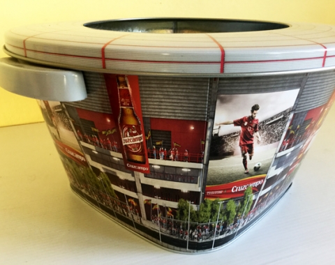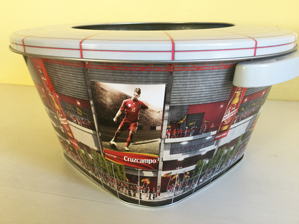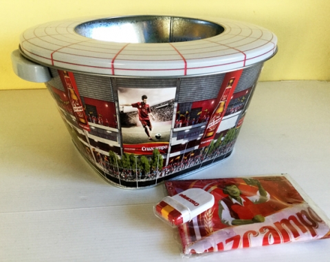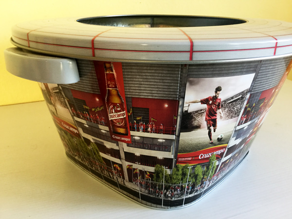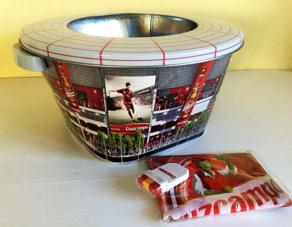 Cubitera Cruzcampo de metal de la Selección Española, con forma de estadio de fútbol. También se incluye unas pinturas para la piel con el logo de Crizcampo y una botella hinchable de Cruzcampo. El kit perfecto para animar a la Selección. Medidas de la cubitera: 30 cm de diámetro x 16 cm de alto. Está en muy buen estado, todo por estrenar.