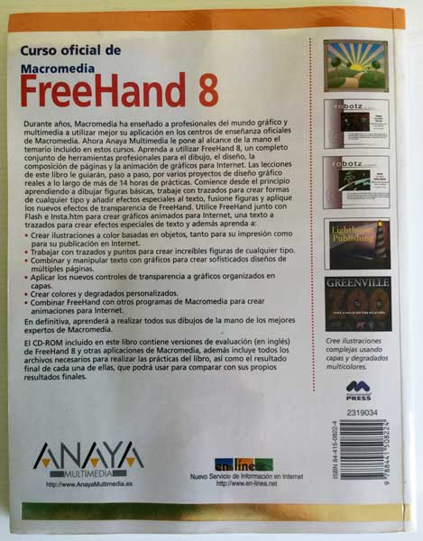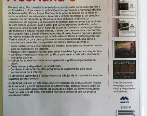 Curso oficial de Macromedia Freehand 8. Editado en 1999. Incluye todas las materias tratadas en los centros de enseñanza oficiales de Macromedia. Anaya Multimedia, Diseño y Creatividad. Incluye CD-ROM. Está en muy buen estado, libro forrado, bien protegido. Tiene 256 páginas. En algunas páginas hay textos subrayados.