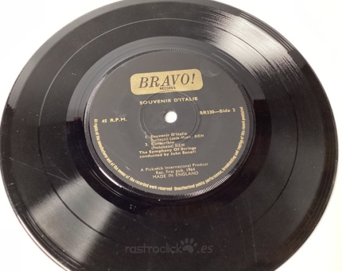 Disco de vinilo de 45rpm. Souvenir d’Italie. De Bravo Records. Fabricado en Inglaterra en 1964. El disco tiene signos del uso y del paso del tiempo. No se ha podido probar al no disponer de un reproductor.