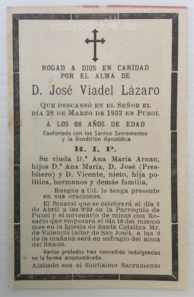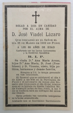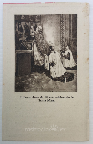 El Beato Juan de Ribera celebrando la Santa Misa, en el reverso tiene una esquela de alguien que murió el 28 de Marzo de 1932.