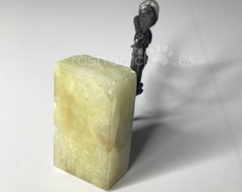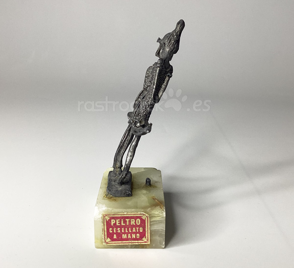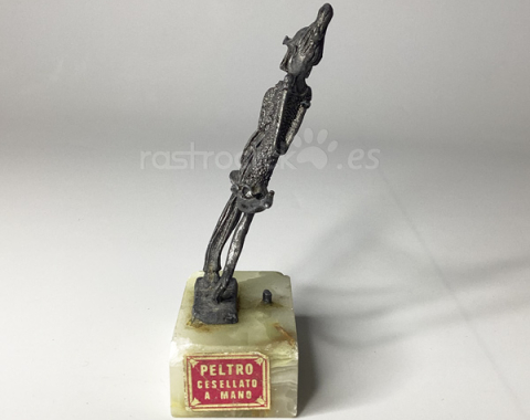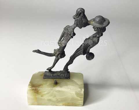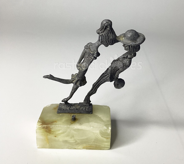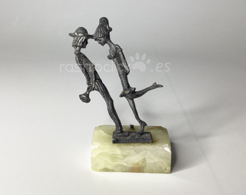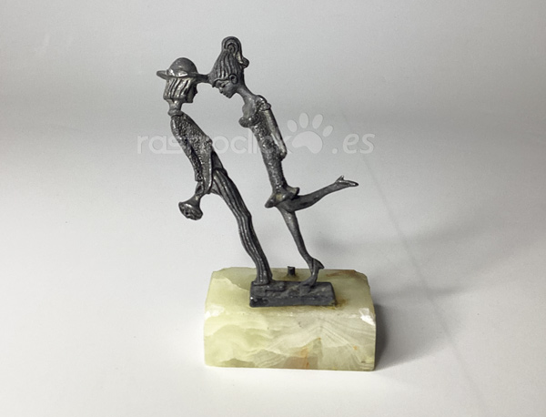 Figura de una pareja de enamorados. Fabricada en Italia. Con signos del paso del tiempo. La figura está torcida, se guardó mal durante tiempo. Está sobre una base de mármol. No se sabe si le falta alguna pieza, ya que hay un resto roto en la base de mármol. En la base tiene una etiqueta en la que dice: “PELTRO CESELLATO A MANO” está en italiano y significa:
