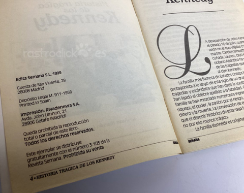 Librito obsequio de la revista Semana: Historia trágica de los Kennedy. Editado por Semana S.L. en 1999. Cuenta la historia trágica de la familia Kennedy. La revista está en buen estado, con signos de uso.
