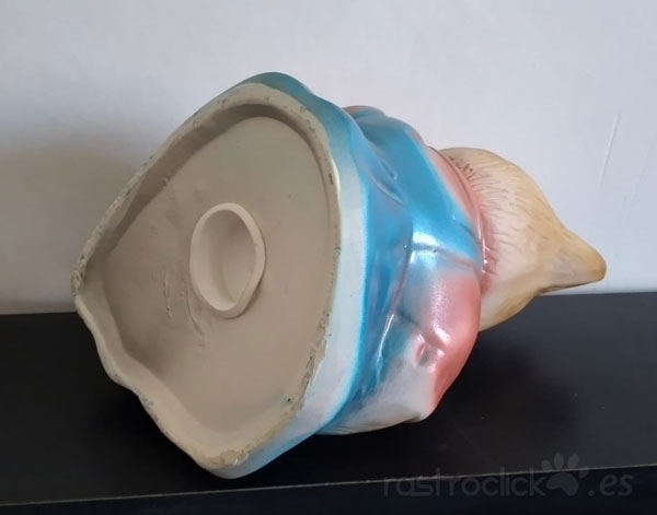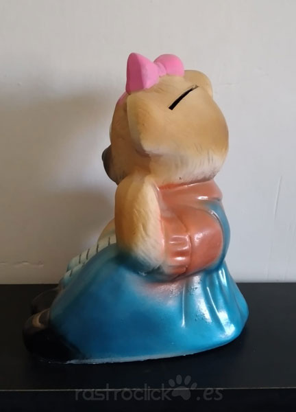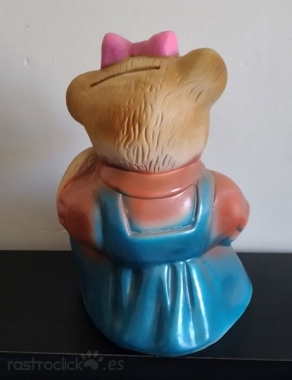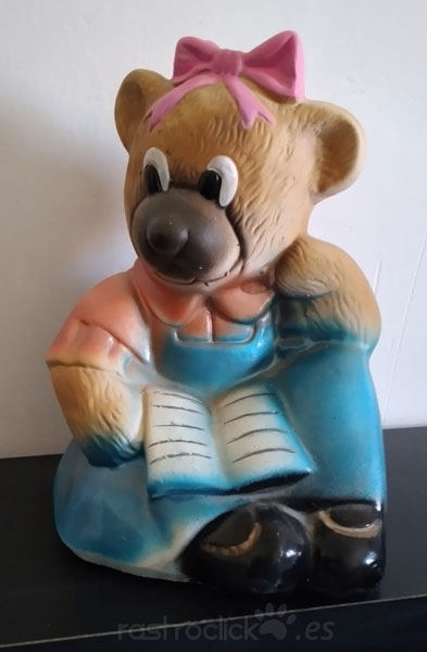 Hucha de cerámica. Osita leyendo con vestido azul. Tiene en la base un tapón para poder sacar el dinero. Está como nueva.