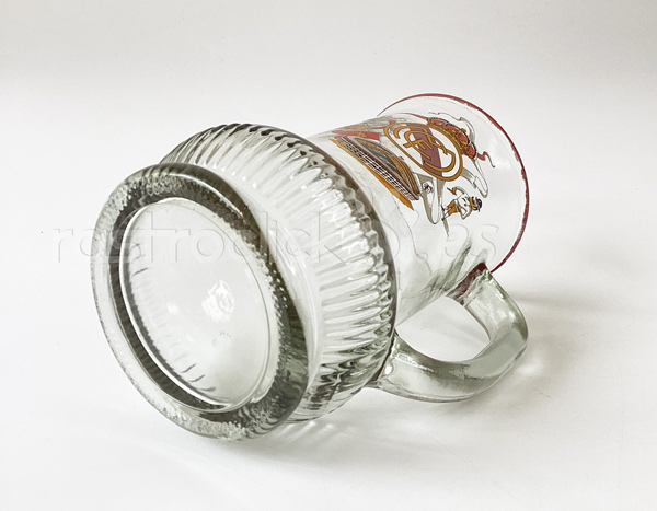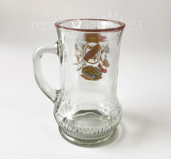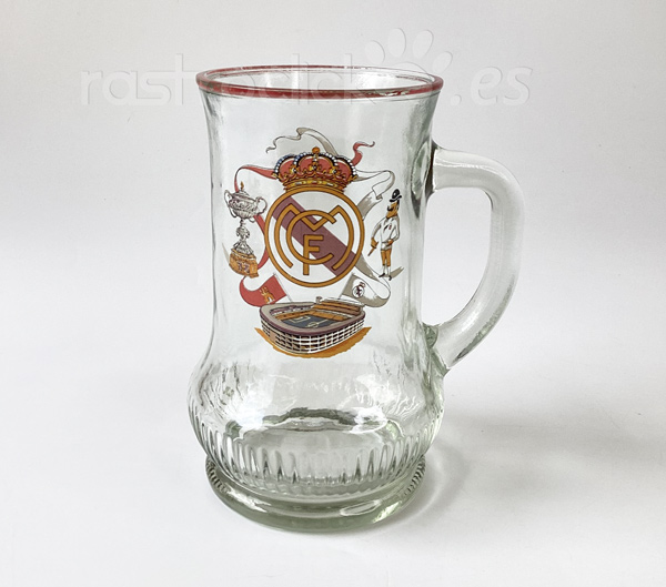 Jarra de cerveza Real Madrid. Material de cristal. Base con relieve. Escudo y dibujo del campo serigrafiado. Asa lateral. Altura de 12 cm.