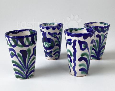 Antigua jarra y 4 vasos inspirados en la cerámica Fajalauza Granada. Vidriada y pintada a mano con motivos florales y vegetables. Los vasos son pequeños, ideales para vino. Los vasos miden 7,5cm de alto. La jarra mide 17,5 cm de alto.