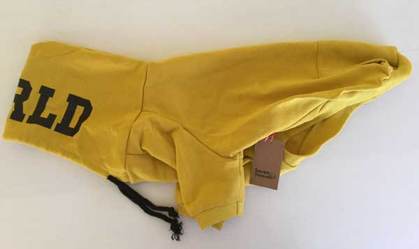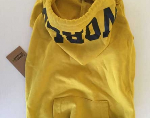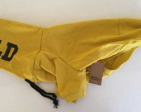 Jersey para perro, con capucha, color amarilla. Marca Seven Heaven. Nuevo a estrenar. Talla XXXL (3XL). Medidas; cuello: 40cm, pecho: 58cm, longitud lomo: 38cm. 100% algodón. Excelente calidad.