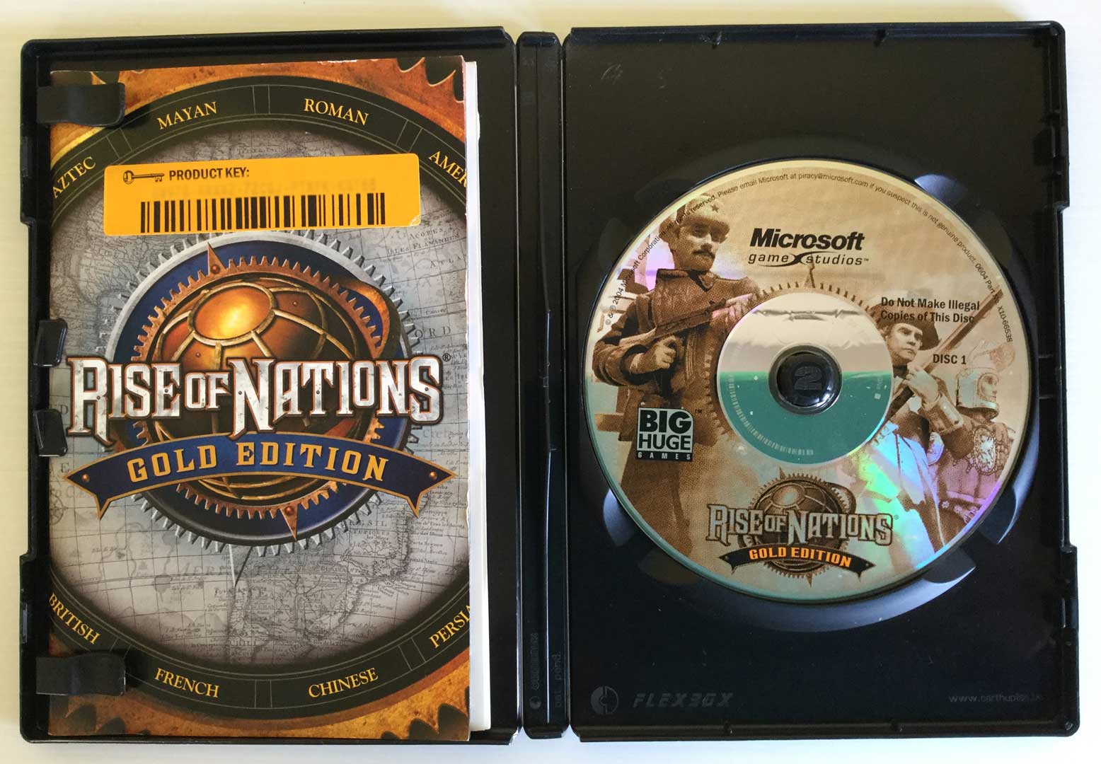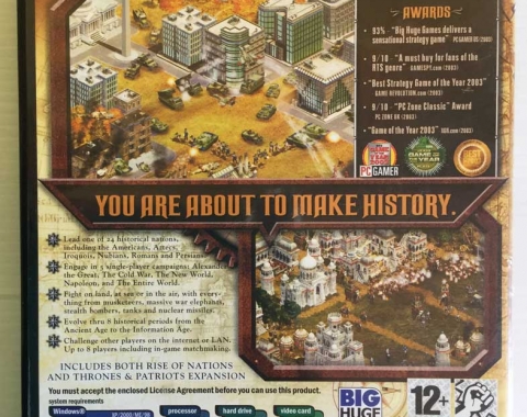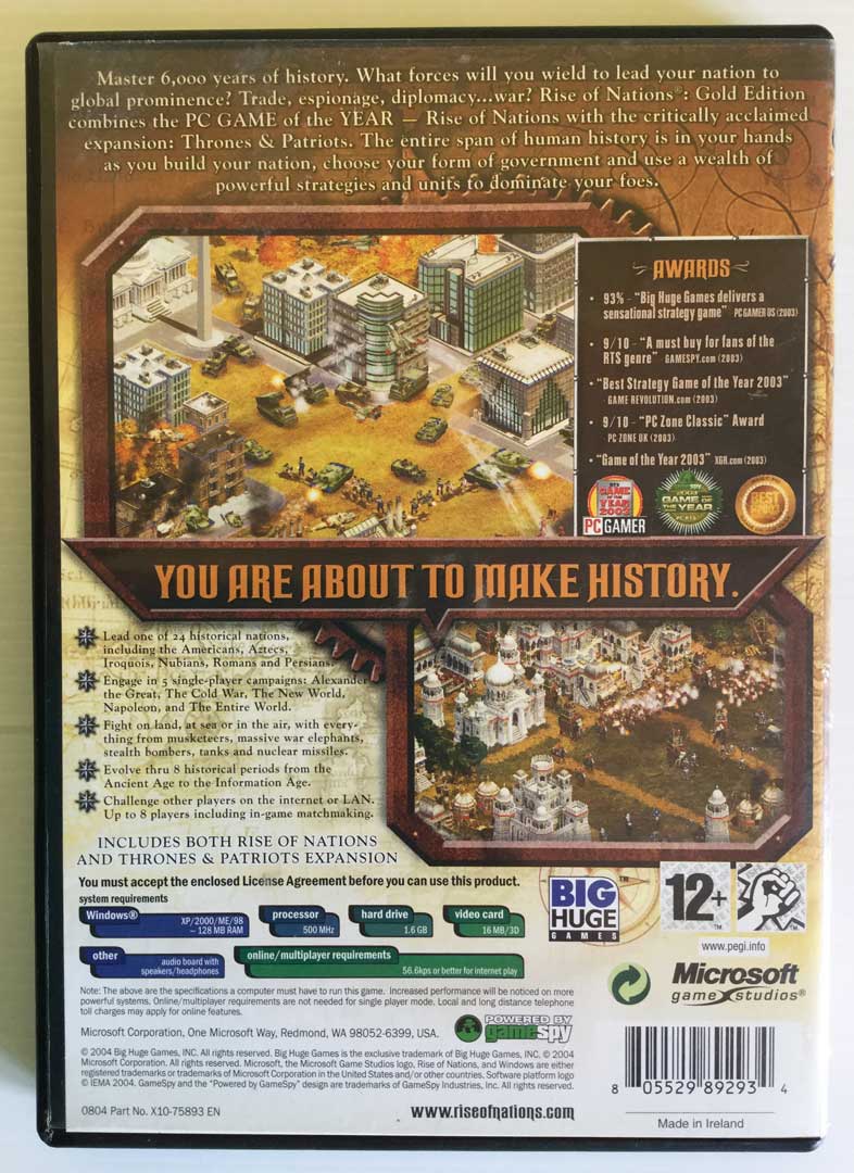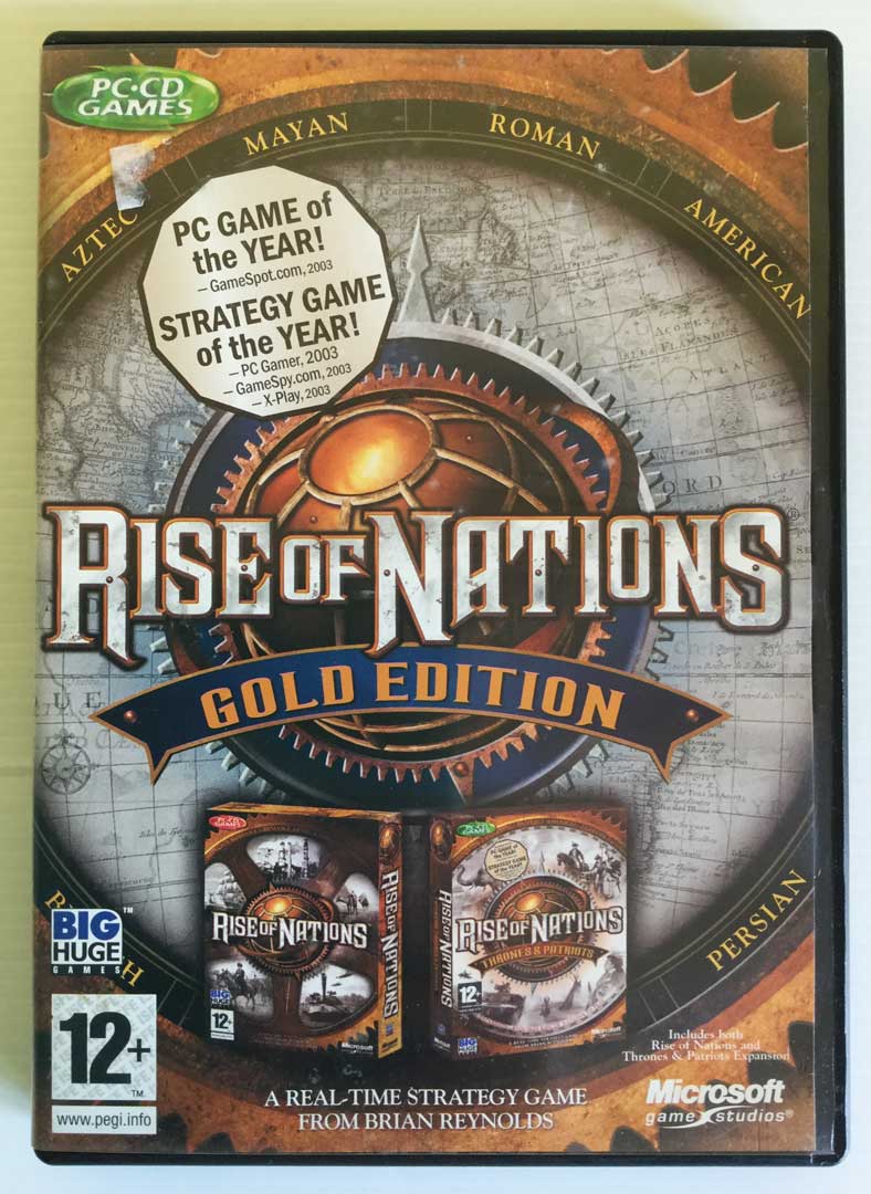 Juego para PC, Rise of Nations Gold Edition, fabricado en Irlanda, viene en idioma inglés. Artículo usado, en buen estado. Con su caja original y manual de juego. Rise of Nations es un videojuego de estrategia en tiempo real desarrollado por Big Huge Games y creado por Brian Reynolds. El 28 de abril de 2004 se publicó su expansión, Rise of Nations: Thrones and Patriots. Rise of Nations se caracteriza por la construcción de ciudades, requisito para el comercio y la construcción de algunos edificios.