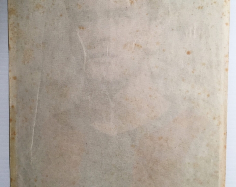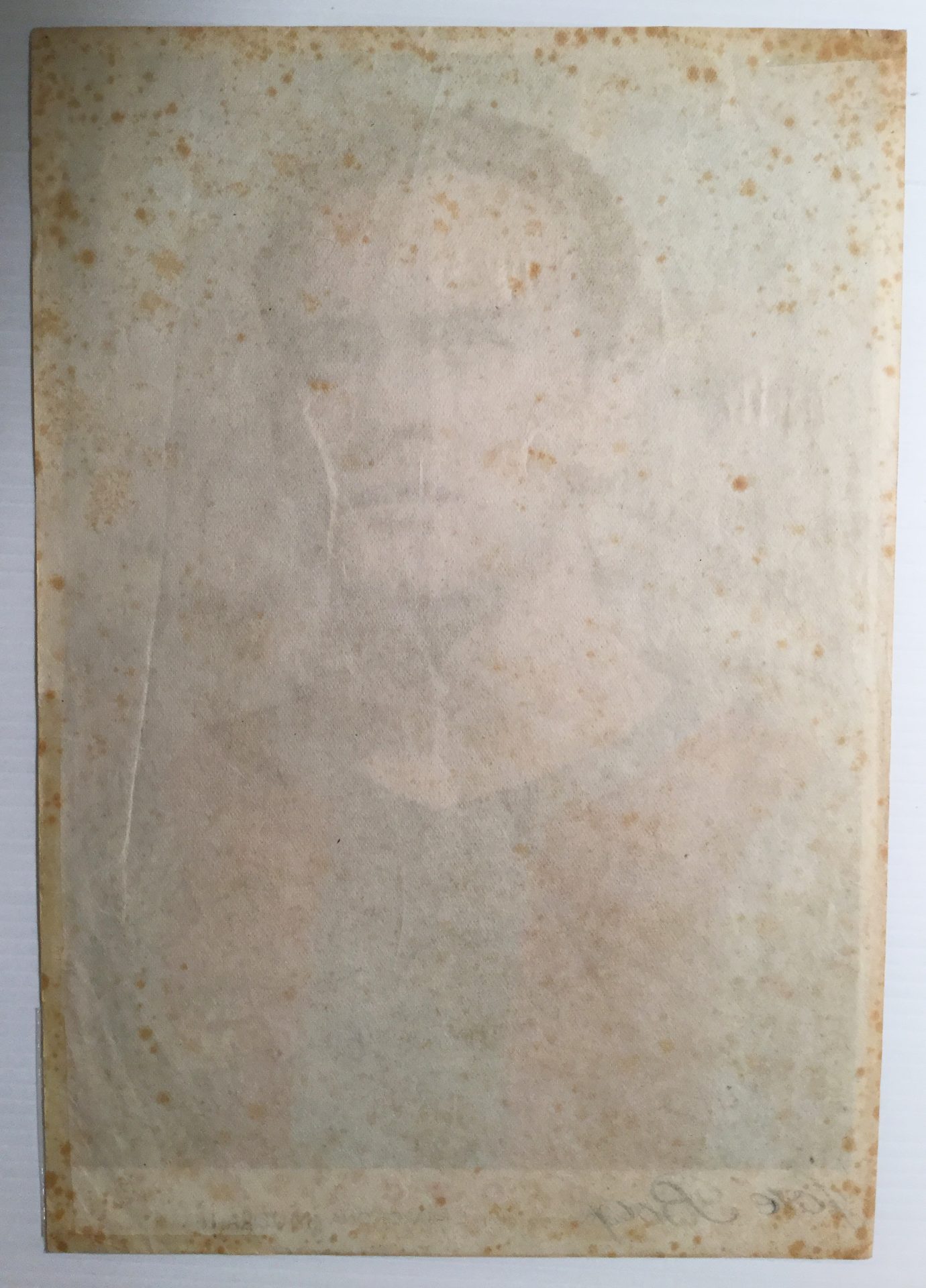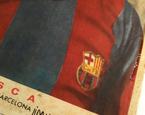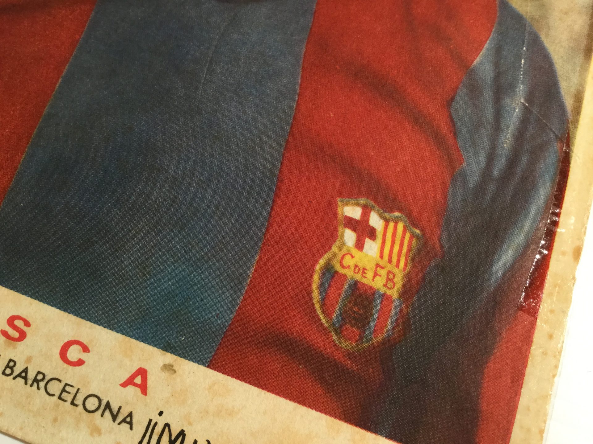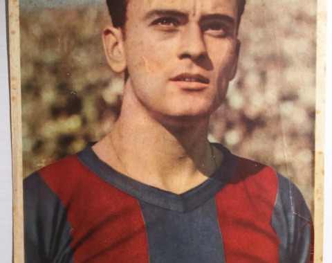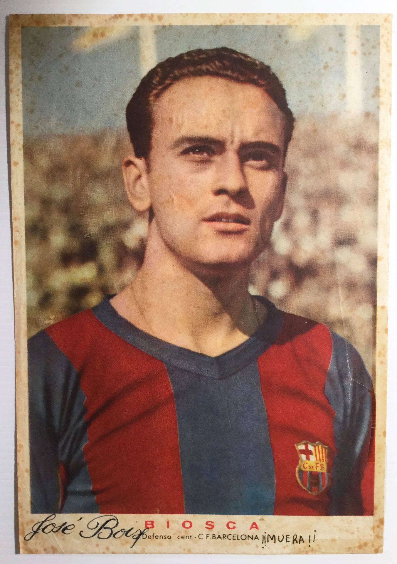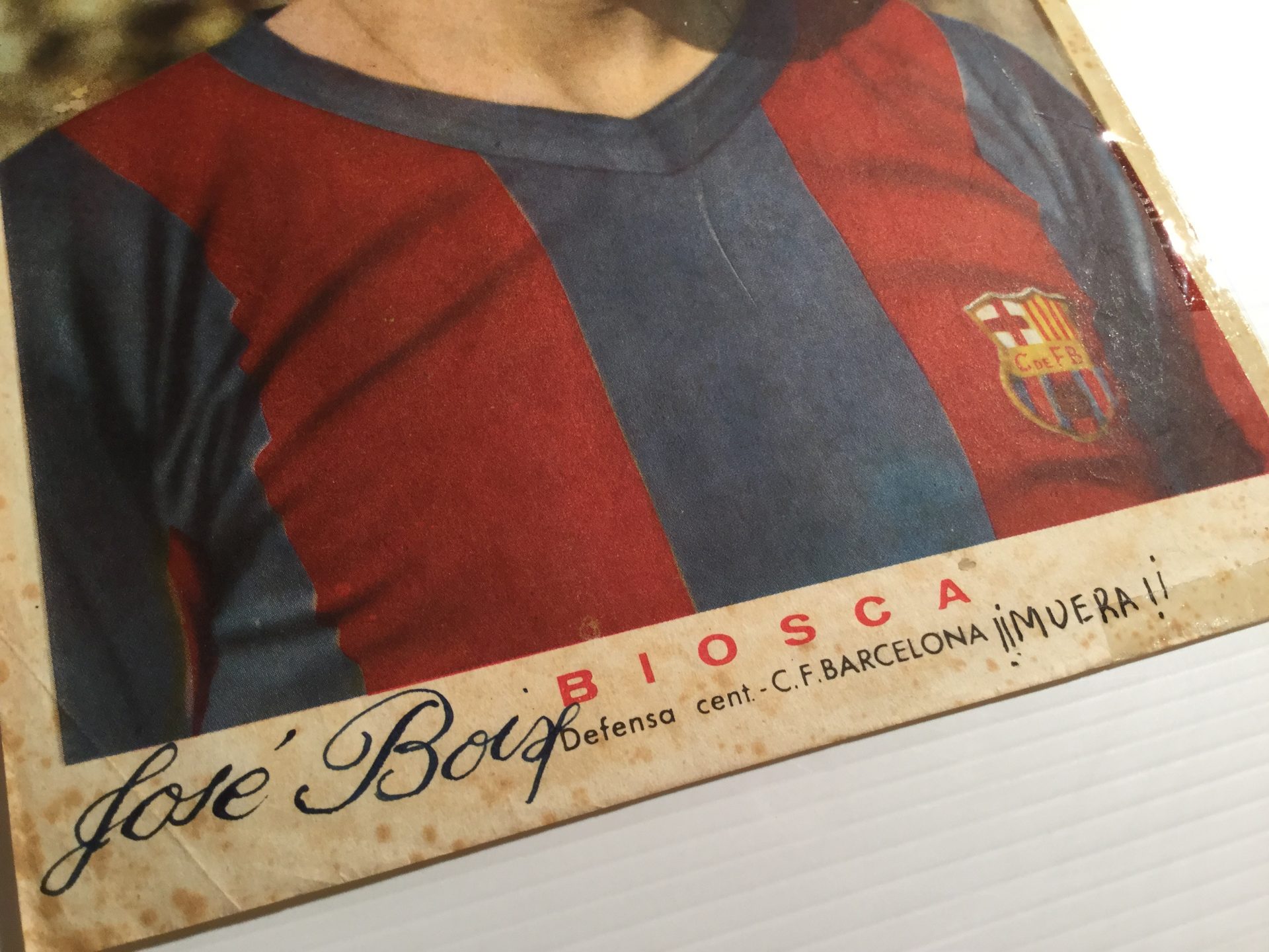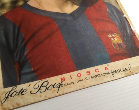 Lámina del defensa central Biosca, del Club de Fútbol del Barcelona, en los años 50. Su antiguo dueño, cuyo nombre escribió en la lámina, no debió ser muy aficionado suyo por lo que puso en ésta. Tiene signos visibles del paso del tiempo.