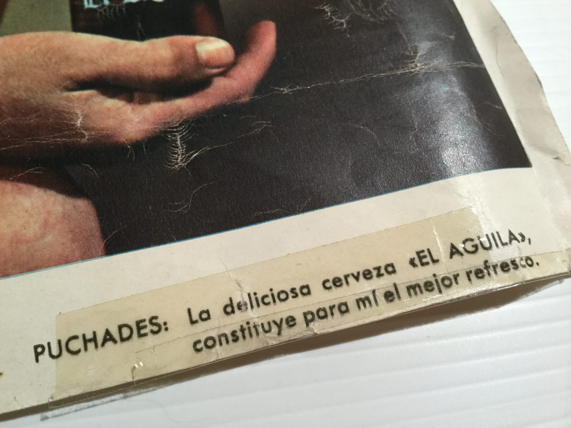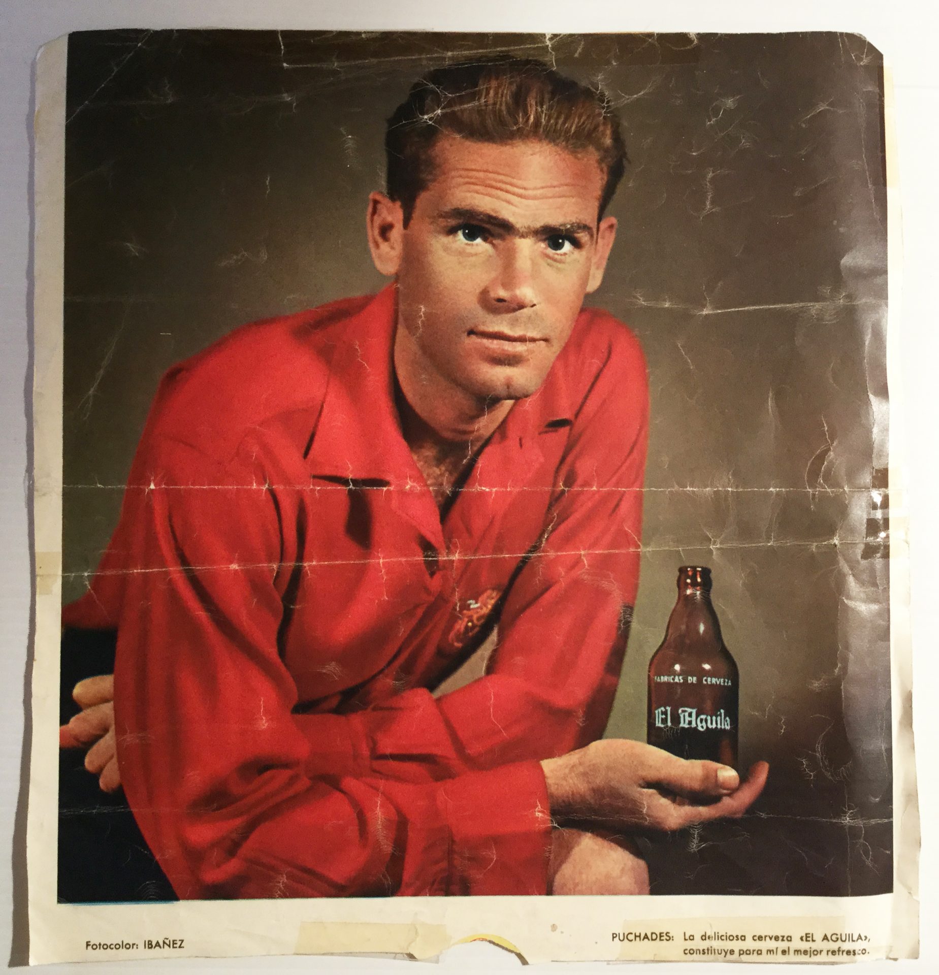 Lámina de Puchades, con la camiseta de la Selección española de fútbol, anunciando Cerveza El Águila en el año 1950 aproximadamente. Frase de Puchades para el anuncio: “La deliciosa cerveza “El Águila” constituye para mí el mejor refresco”. La lámina tiene signos notables del paso del tiempo, como se puede apreciar en las fotos.