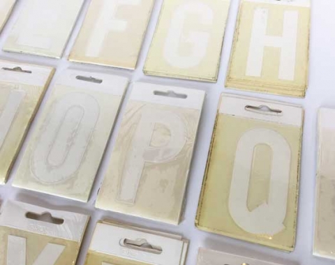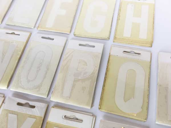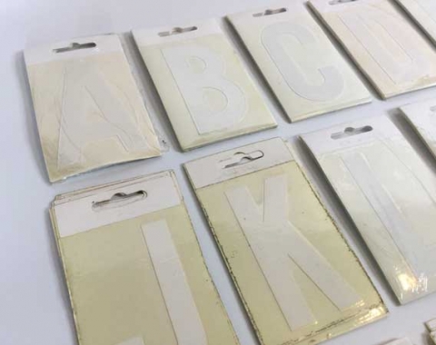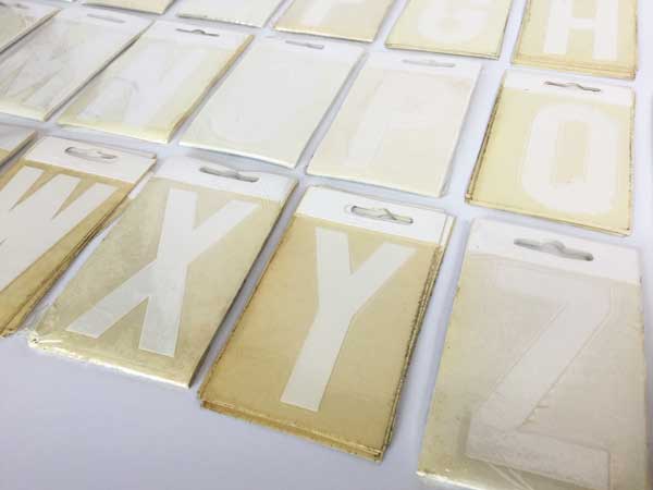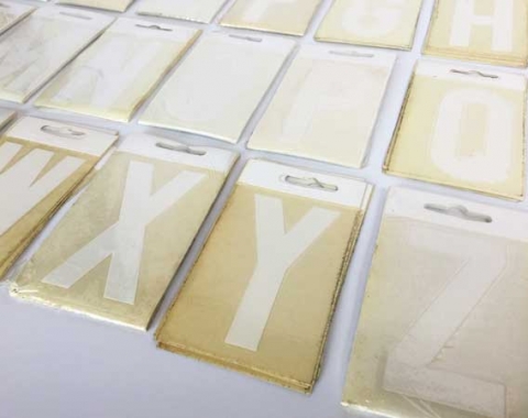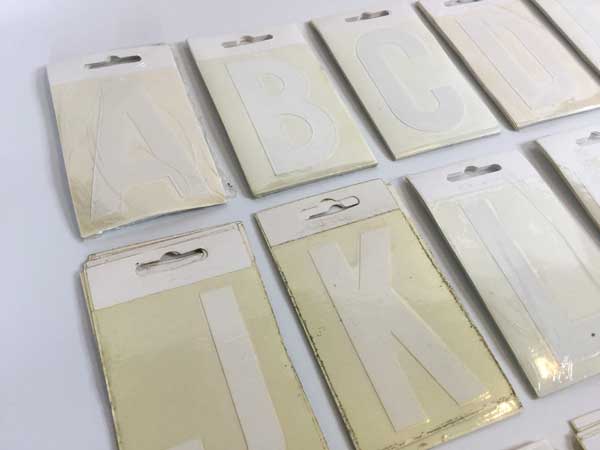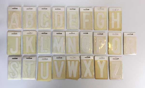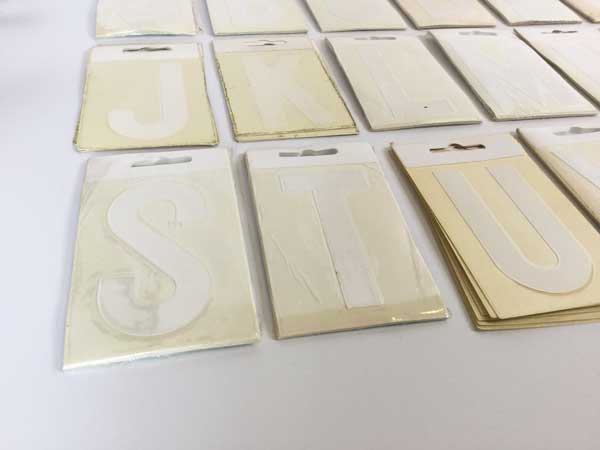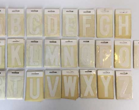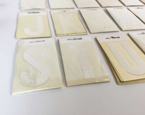 Letrayón. Letras blancas de plástico autoadhesivas, aplicables a todas las superficies. Miden 8cm de alto. Estas letras tienen ya unos 30 años. Son de principios de los 90. El lote consta de un total de 212 letras, compuesto por: 17 paquetes precintados de 10 unidades cada paquete, letra G 5 unidades, letra H 5 unidades, letra J 5 unidades, letra K 5 unidades, letra Q 3 unidades, letra U 10 unidades, letra W 4 unidades y letra Y 5 unidades. Están en muy buen estado. Con algún signo del paso del tiempo.