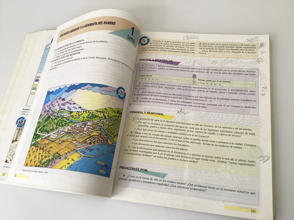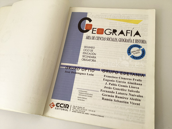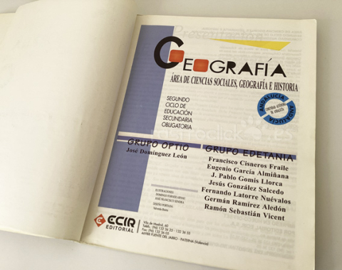 Libro de Geografía. De la ESO, Segundo Ciclo. ECIR Editorial. Grupo Edetania. I.S.B.N.: 84-7065-262-1. De 1996. Tiene algunas páginas subrayadas y con dibujos con lápiz. La contraportada tiene nombres escritos con bolígrafo. Bien conservado.
