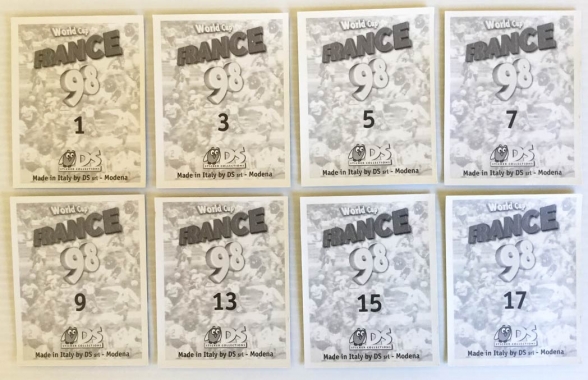 Lote 10 cromos France 98 DS Sticker Collections. En muy buen estado, bien conservado. Los números son: 1, 3, 5, 7, 9, 13, 15 y 17. Tengo también el álbum con 230 cromos pegados por 37 € + 14 repetidos de regalo.