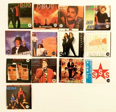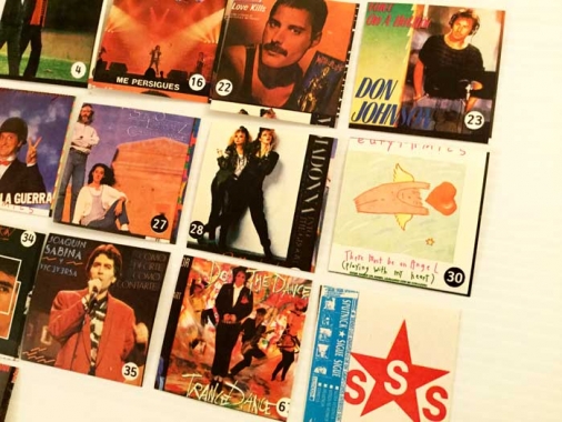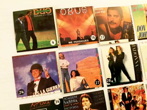 Lote de 14 cromos de discos de los años 80. Duran Duran, Bruce Springsteen, Madona, Mecano… etc. Una colección rara y curiosa. Tengo los siguientes números: