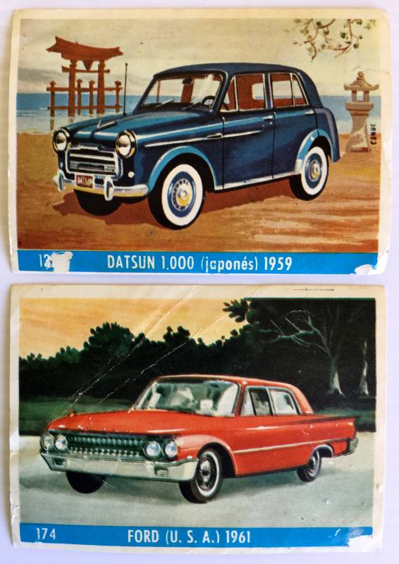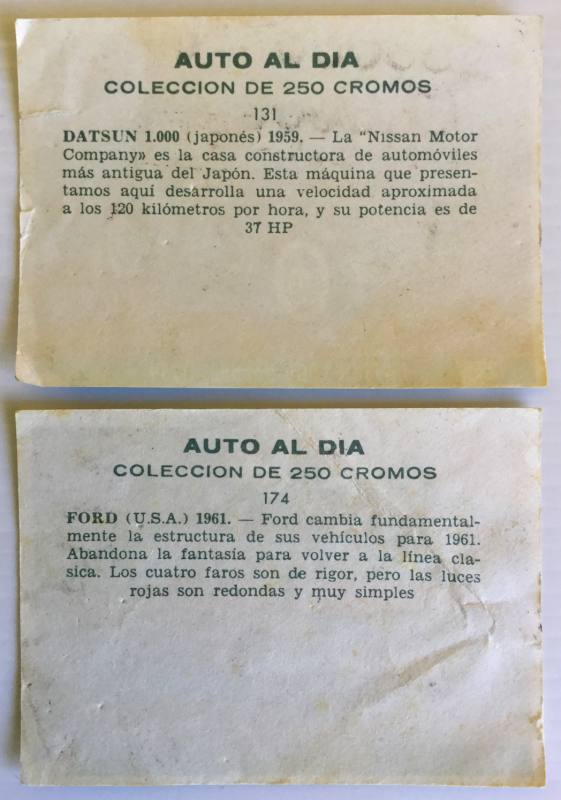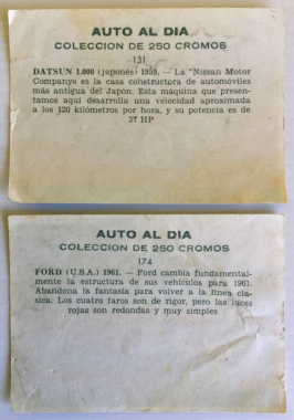 Lote 2 cromos Auto al día Nº174 y Nº131 de la Editorial Bruguera. Año 1954. Nunca pegados. Con signos del paso del tiempo.