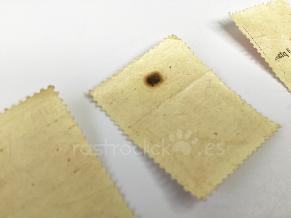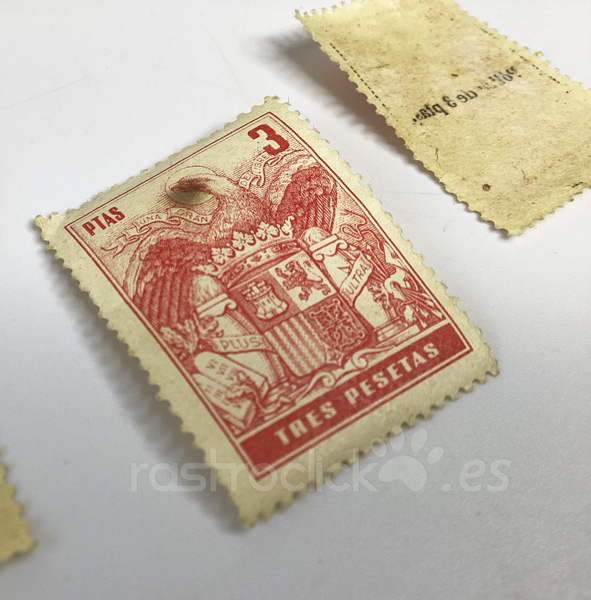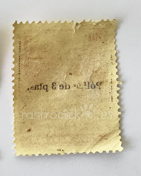 En el reverso de los sellos, uno de ellos tiene una impresión deliberada en tinta negra. Este tipo de marcas se ponían cuando el sello se utilizaba como Póliza (en este caso, pone “Póliza de 3 ptas.”). En muchos documentos oficiales, se exigía que en el reverso del sello figurara su concepto y valor para evitar que se despegara de un documento y se reutilizara en otro (una medida antifraude). Fue un sello preparado para ser usado en un documento que finalmente no se llegó a tramitar o que se guardó como muestra.
