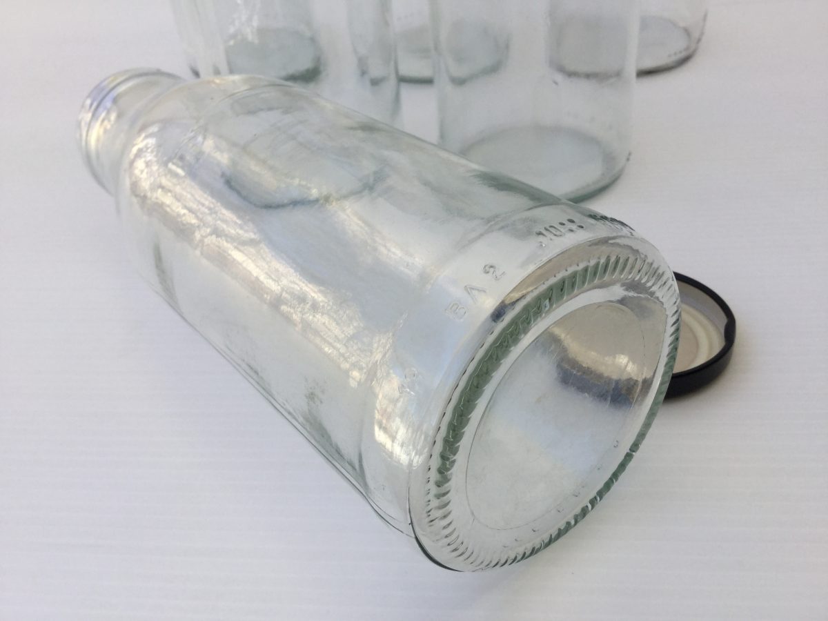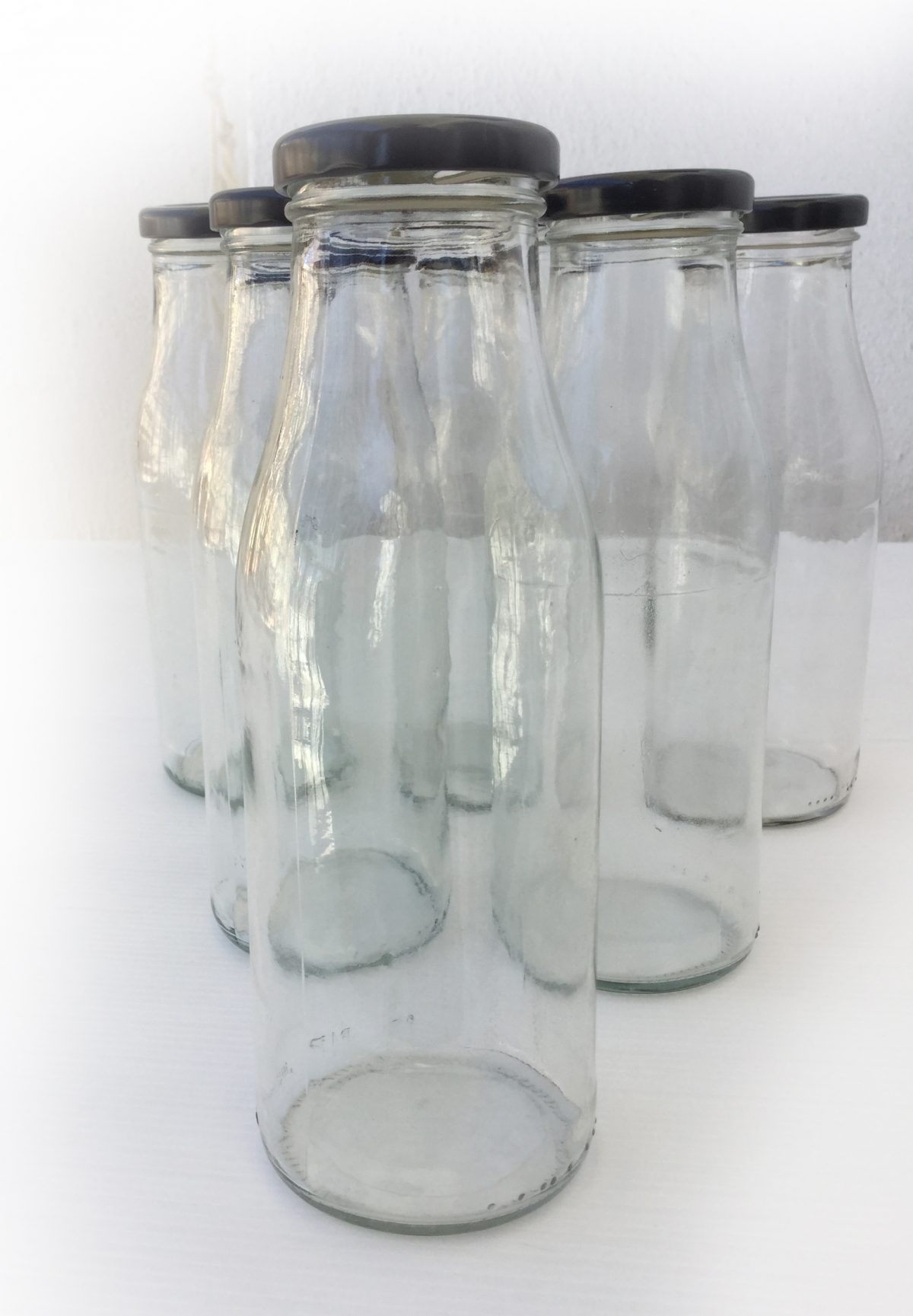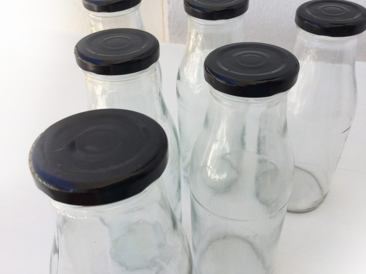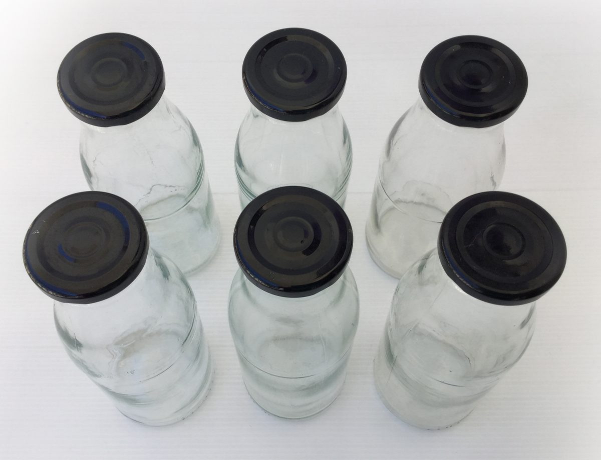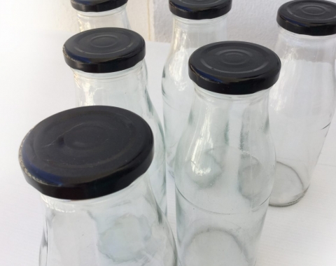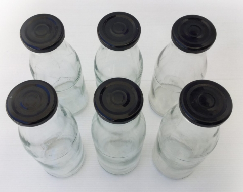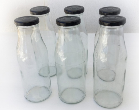 Lote de 6 botellas de vidrio de 500ml. Con tapadera de metal negra. Capacidad de 500ml. Miden 19,5 de alto, el diámetro de la base es de 7cm y el de la boca es de 4cm. No son antiguas, son de actualidad.