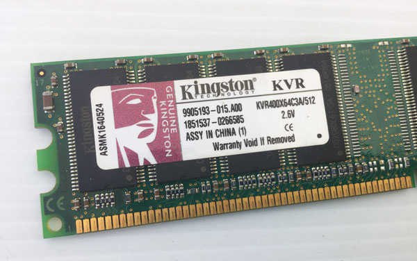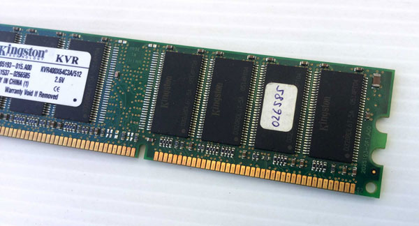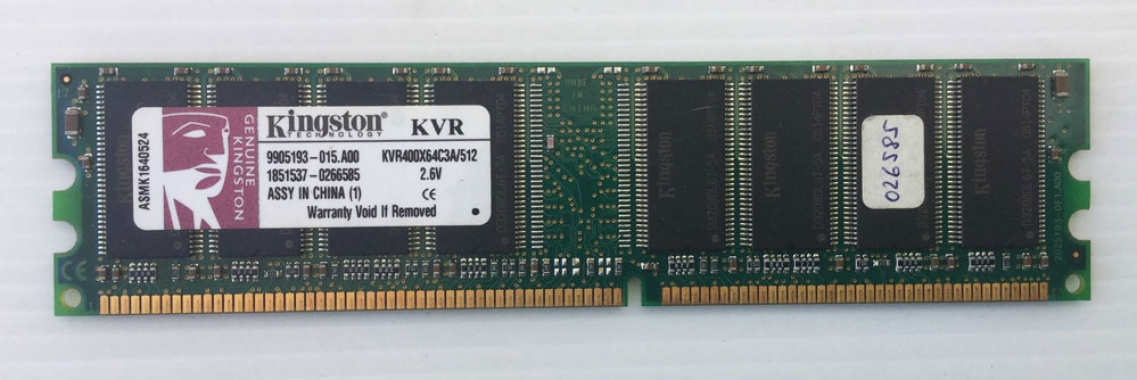 Módulo de memoria DDR-400 512MB. Marca: Kingston. KVR400X64C3A/512. Se desmontó hace tiempo, no se ha vuelto a probar.