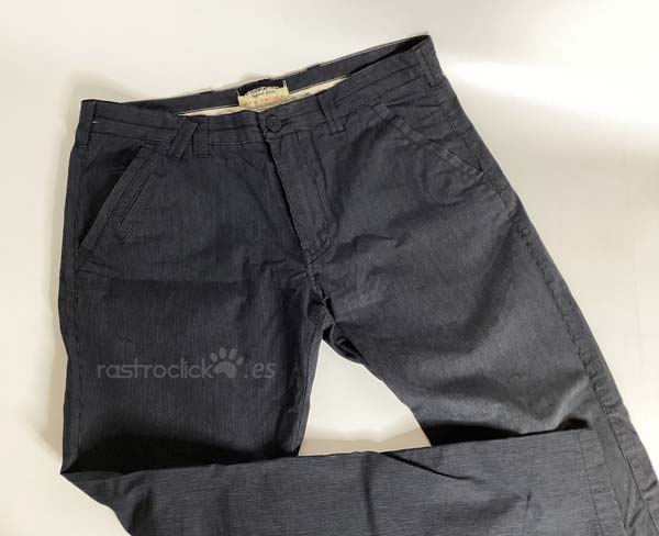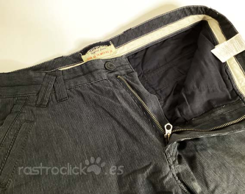 Pantalón chino Springfield Original Pants. Color negro a rayas. Talla 46. Composición: 100% algodón. Muy poco uso, está como nuevo. Cierre con cremallera y botón. Longitud del camal interior 76cm. Longitud del camal exterior 103,5cm. Ancho de la cintura 44cm. Ancho camal parte superior 23cm. Ancho camal parte inferior 19cm.