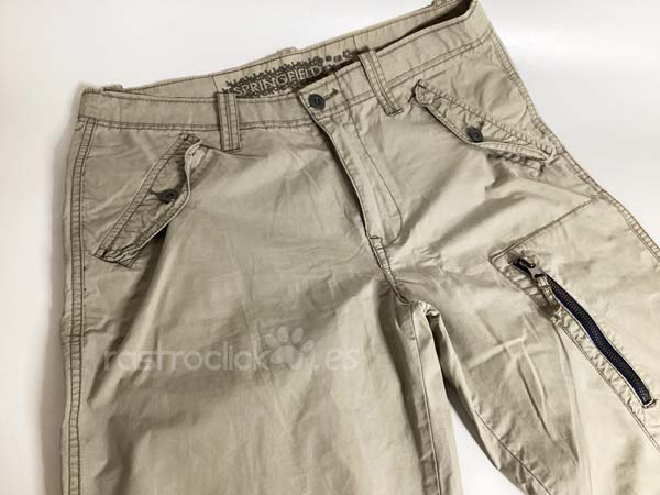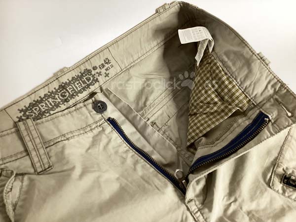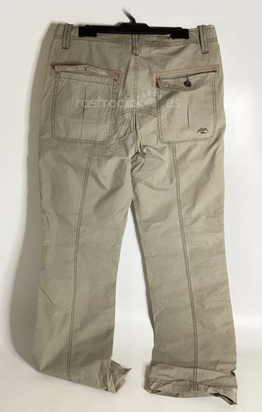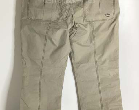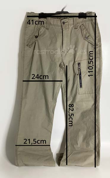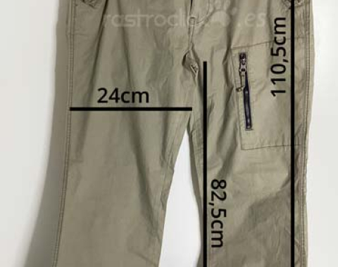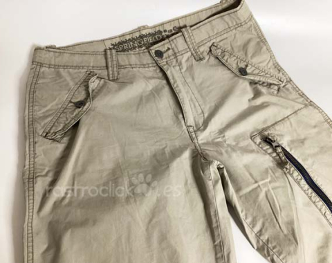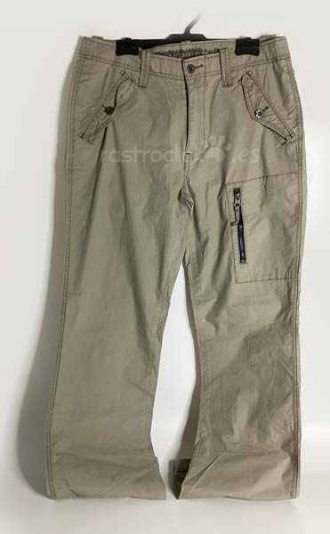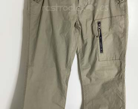Pantalón Springfield Ocean tales. Color caqui claro. Talla 42. Composición: 100% algodón. En buenas condiciones. Se le hizo un pespunte para meterle el camal, pero no se llegó a coser, se le ha quitado el pespunte. Le falta un botón en un bolsillo trasero. Cierre con cremallera y botón de metal. Longitud del camal interior 82,5cm. Longitud del camal exterior 110,5cm. Ancho de la cintura 41cm. Ancho camal parte superior 24cm. Ancho camal parte inferior 21,5cm.