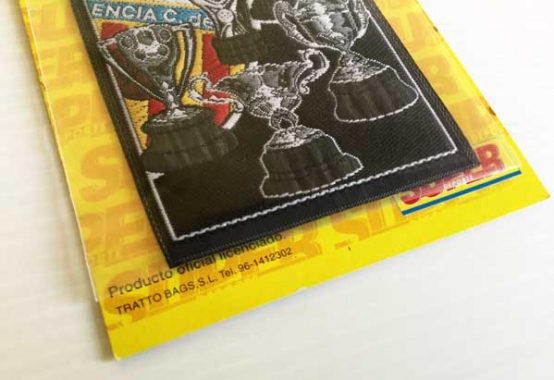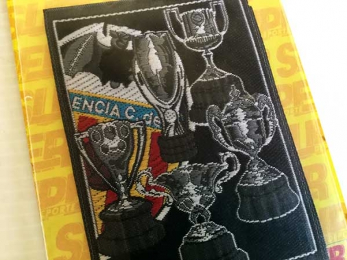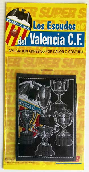 Parche de tela termoadhesivo Valencia CF diseño escudo y copas. Aplicación adhesivo por calor o con costura. Regalo del periódico Super Deporte en los años 90. Nuevo a estrenar. Producto Oficial Licenciado.