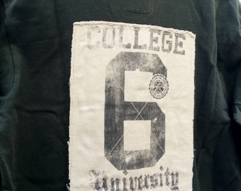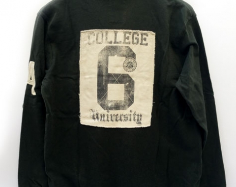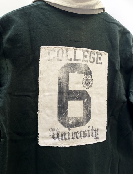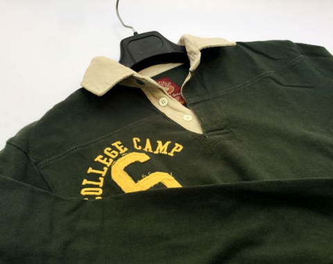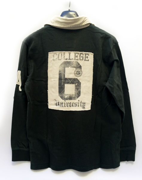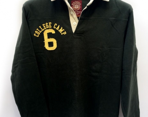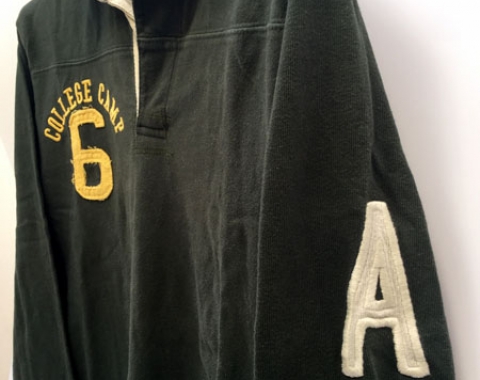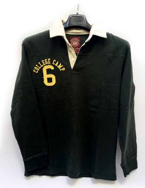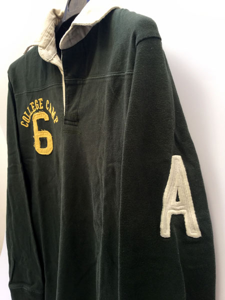 Polo Springfield College Camp University. De segunda mano. En muy buen estado. Talla M. Medidas: de hombro a hombro – 44cm, de axila a axila – 53cm, longitud del cuello abajo - 66cm y longitud de la manga – 58cm. Color verde. Con letras y número bordado, color amarillo, en la parte delantera derecha con la palabra College camp y el número 6. Tiene en la manga derecha la letra A cosida. Y detrás una tela cosida con las palabras College University y el número 6. La composición es 100% algodón.