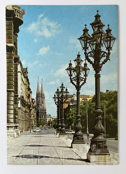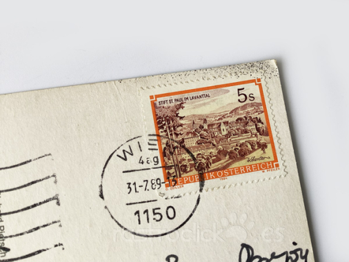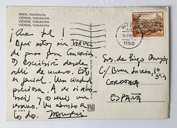 Postal de Viena circulada el 31 de julio de 1989 según el matasellos de Viena, con código/distrito postal 1150. El sello es de 1984, con un valor de 5 chelines.