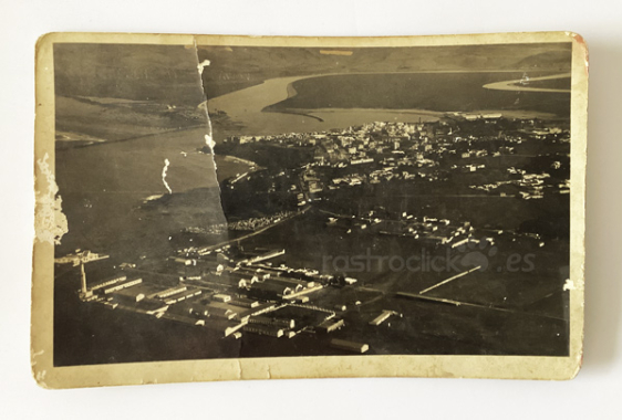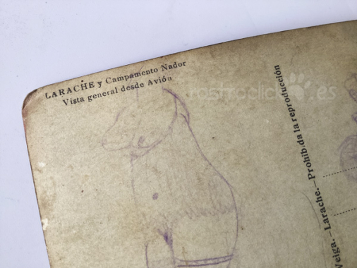 Postal LARACHE y Campamento Nador. Vista aérea. Edición: M. Veiga – Larache. Mide 14 x 9 cm. Es de la década de los años 20 o principios de los 30. Los dibujos son añadidos posteriores por el que fue su propietario.