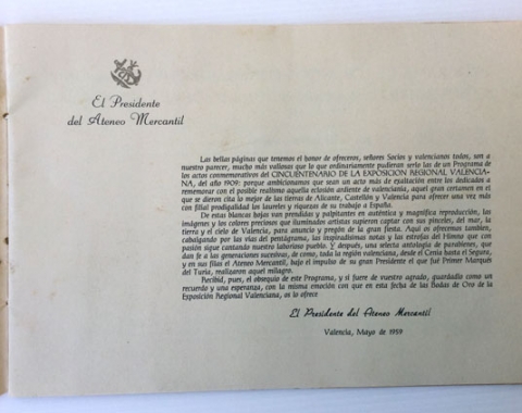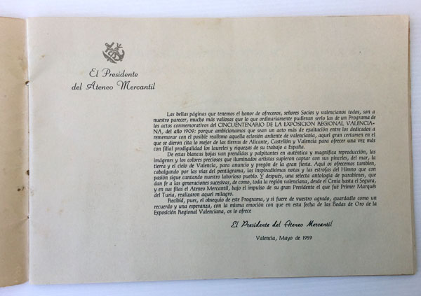 Programa de actos Cincuentenario de la Exposición Regional Valenciana 1909 – 1959 – Ateneo Mercantil