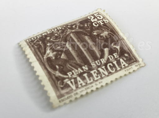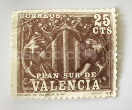 Es un sello de 25 céntimos del "Plan Sur de Valencia", emitido originalmente en 1980 (como indica la fecha "1980" en la esquina inferior derecha, junto a las siglas FNMT). Representa el Escudo de Valencia del siglo XV.