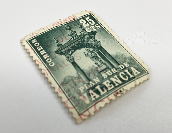 Fue un sello de recargo obligatorio. Tras la trágica riada de Valencia en 1957, el Estado decidió desviar el río Turia para evitar nuevas catástrofes (el famoso "Plan Sur"). Para financiar esta obra faraónica, se impuso que toda la correspondencia de Valencia capital y su provincia (y también muchos documentos) llevaran este sello adicional de 25 céntimos.