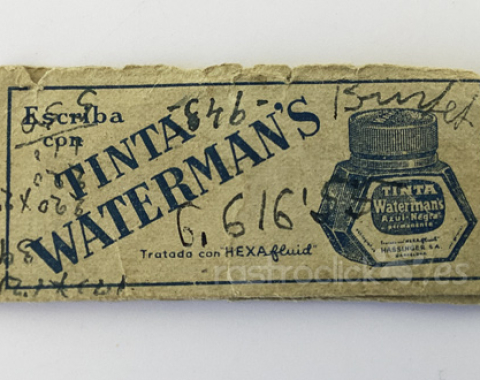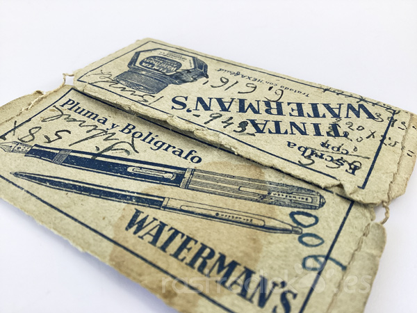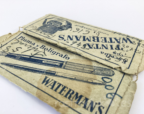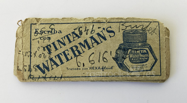 Sobre con información de las tarifas postales. Publicidad de Pluma y bolígrafo Waterman’s y Tinta Waterman’s. De 1956. Tiene claros signos del paso de tiempo y algunas anotaciones escritas en él.