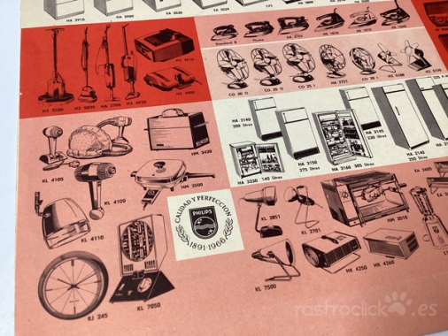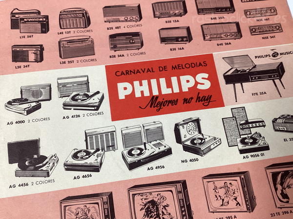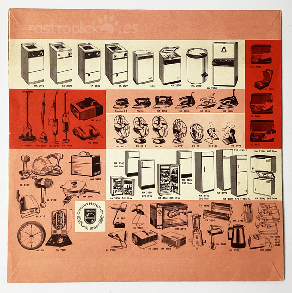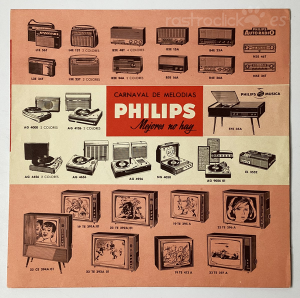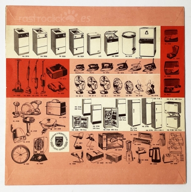 Es un sobre vacío para discos de vinilo de 45rpm, en el que Philips mostraba todos sus productos de la época, con el nombre del modelo escrito en cada uno de los productos. Artículos Philips de los años 60. En él se mostraban transistores, radios, auto radios, tocadiscos, grabadoras, televisores, lavadoras, aspiradoras, planchas, ventiladores, tostadoras, secadores, neveras, etc. El sobre está muy bien conservado.