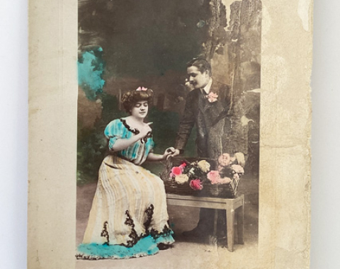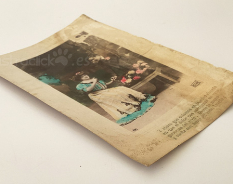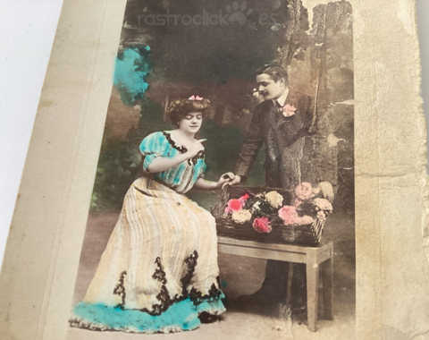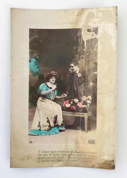 La tarjeta postal muestra una fotografía en blanco y negro que fue coloreada manualmente, una técnica muy común en postales románticas de las décadas 1900–1920.