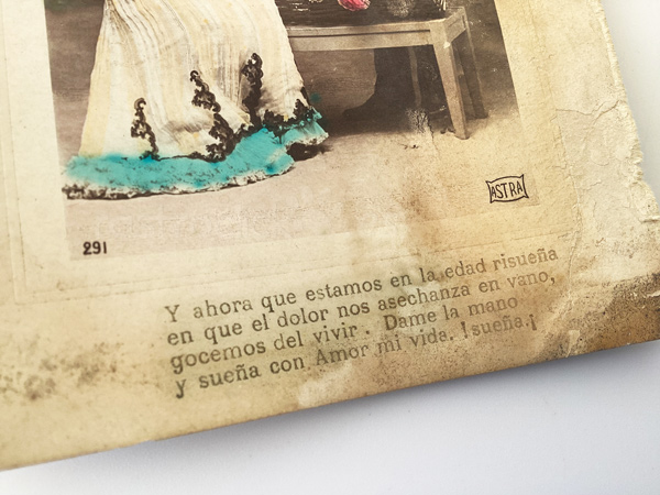ASTRA fue una editorial europea de postales activa en las primeras décadas del siglo XX. Se conocen series románticas numeradas, como la de esta postal, que tiene el número 291.