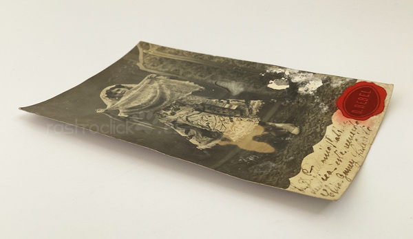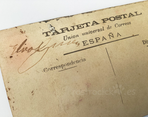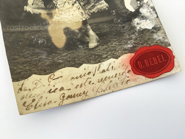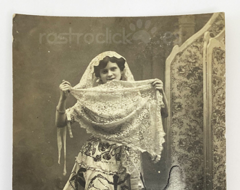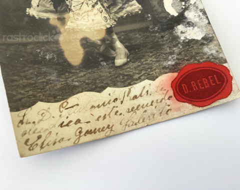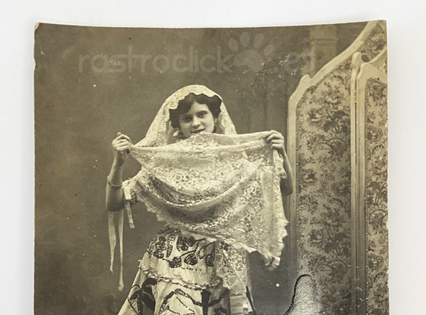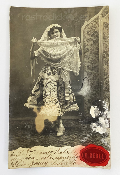 Tarjeta postal de bailarina de variedades de los años 1900-1920. Podría llamarse Eloísa Gómez Larelito, por lo que hay escrito en la postal, pero no es seguro. Detrás hay una firma de Eloísa Gómez, pero no se puede confirmar al 100% que sea la chica de la postal.