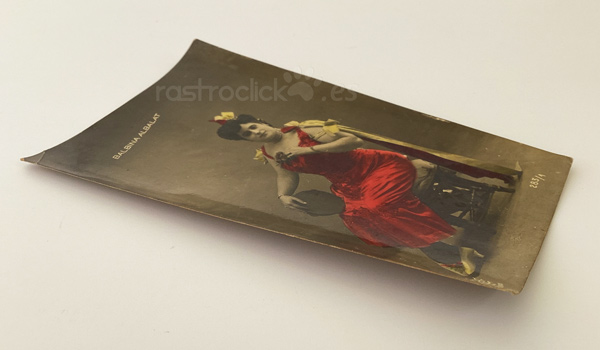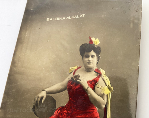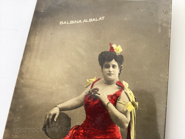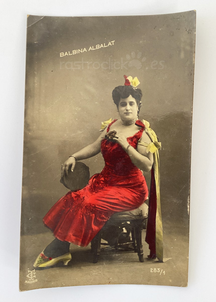 Tarjeta postal de Balbina Albalat, tiple, así se le denomina a las que tienen una voz aguda, con tesitura soprano ligera, pero que no daba la talla vocal para la gran ópera, por lo que se dedicó al mundo de la zarzuela.
